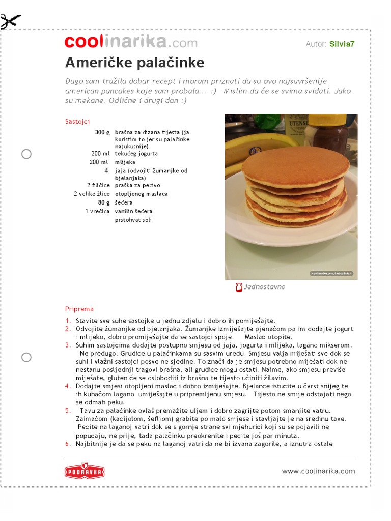 Američke palačinke. U palačinke idu skroz osnovni sastojci a tekući jogurt će im dati lijepu sočnost. Za spremanje poslastice neophodno je pripremiti mleko jogurt ulje šećer brašno prašak za pecivo so jaja. Američke se palačinke od naših razlikuju ponajprije po debljini i veličini. Nadjev ovisi o raspoloženju nekada je to džem nekada ih jedem same a nekada s kolutićima banane i javorovim sirupom lidl ima odličan javorov sirup pristupačne cijene.