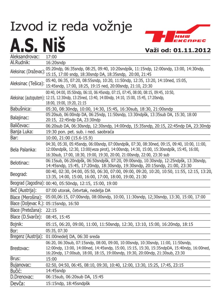 Nis Ekspres Red Voznje Polasci Iz Nisa